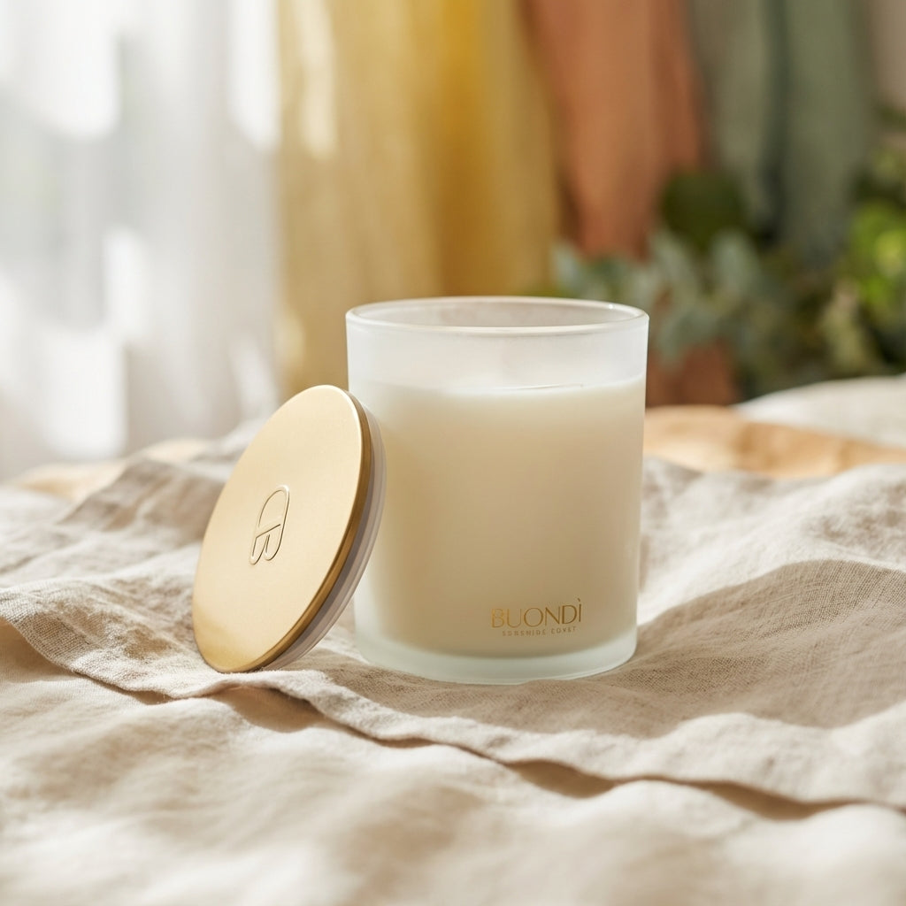 Housed in an elegant glass vessel with a cotton wick, it’s your daily dose of golden light.